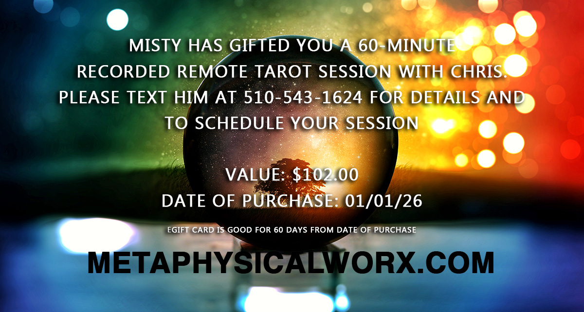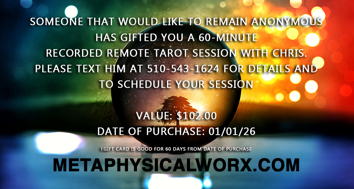 Chris texts this eGift Card to the recipient and lets them know that a 60-minute reading valued at $102.00 has been paid for and gifted to them, and that the person gifting the eGift Card would like to remain anonymous. (Please provide the recipient’s name and phone number, and make sure that the recipient is interested in having a reading. Non-Refundable and good for 60 days from the date of purchase.)